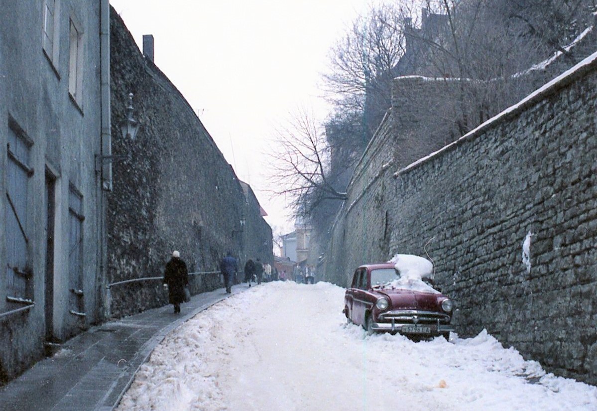 Kan nog ha sett märkligt ut efteråt när vi vänder tillbaka. Jaans steg ser lättare ut. Ser inte sovjetiska soldater eller någon som gör honom nervös. Stannar till vid uppfarten till övre staden, Domberget. Litet smalt, oansenligt, torn. Genom dess fot ser jag en smal gata. Piik Jalg, "den långa". En av vägarna upp till övre staden där de styrande bodde från medeltiden. Följer Jaan, som ibland ta hjälp av handen mot muren, promenerar upp mot Toompea, som det heter på estniska. Hala ojämna kullerstenar.