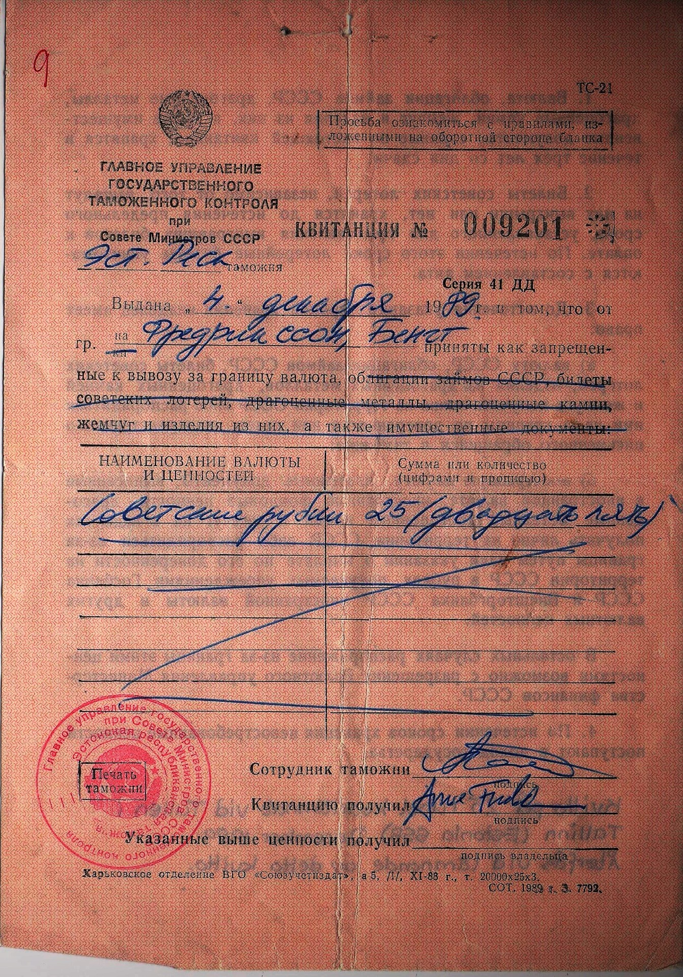 Nickar till en annan man. Lyfter upp ryggsäcken. Sovjetunionen? Ingen öppnade mitt bagage. Ingen muddrade mig för att se om något komprometterande finns. Visas fram till passkontrollen. Någon sekunds blick. Likgiltighet eller snabbt försvunnen misstänksamhet. Blir stående. Mitt pass granskas noga, för hand. Diskussion uppstår mellan två av tjänstemännen. Ett papper plockas fram. Stämplas, läggs i passet och allt lämnas tillbaka. Ingen stämpel i passet. När jag senare skulle åka hem tvingades jag lämna tillbaka alla kontanter, mot kvitto förstås. Trots att de var nästan värdelösa. Viftas iväg. Ingen återvändo.